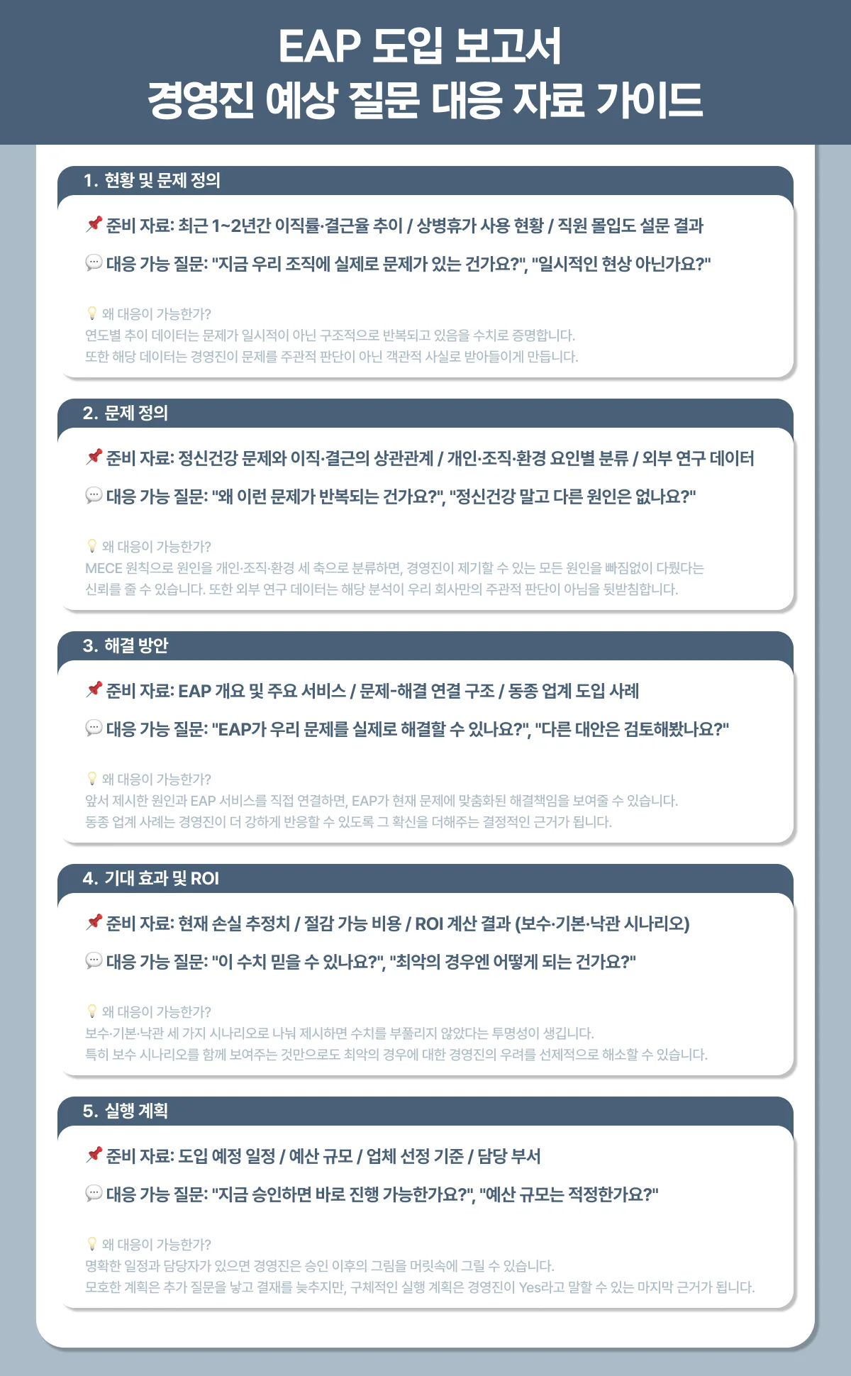 그렇기에 이제는 EAP 도입 보고서를 두고 EAP를 설명하는 문서가 아닌, 경영진이 ‘Yes’라고 말할 수 있도록 설계된 의사결정 지원 문서로 바라봐야 합니다. 이 관점이 바뀌는 순간, 보고서에 담아야 할 내용과 순서가 달라집니다.
