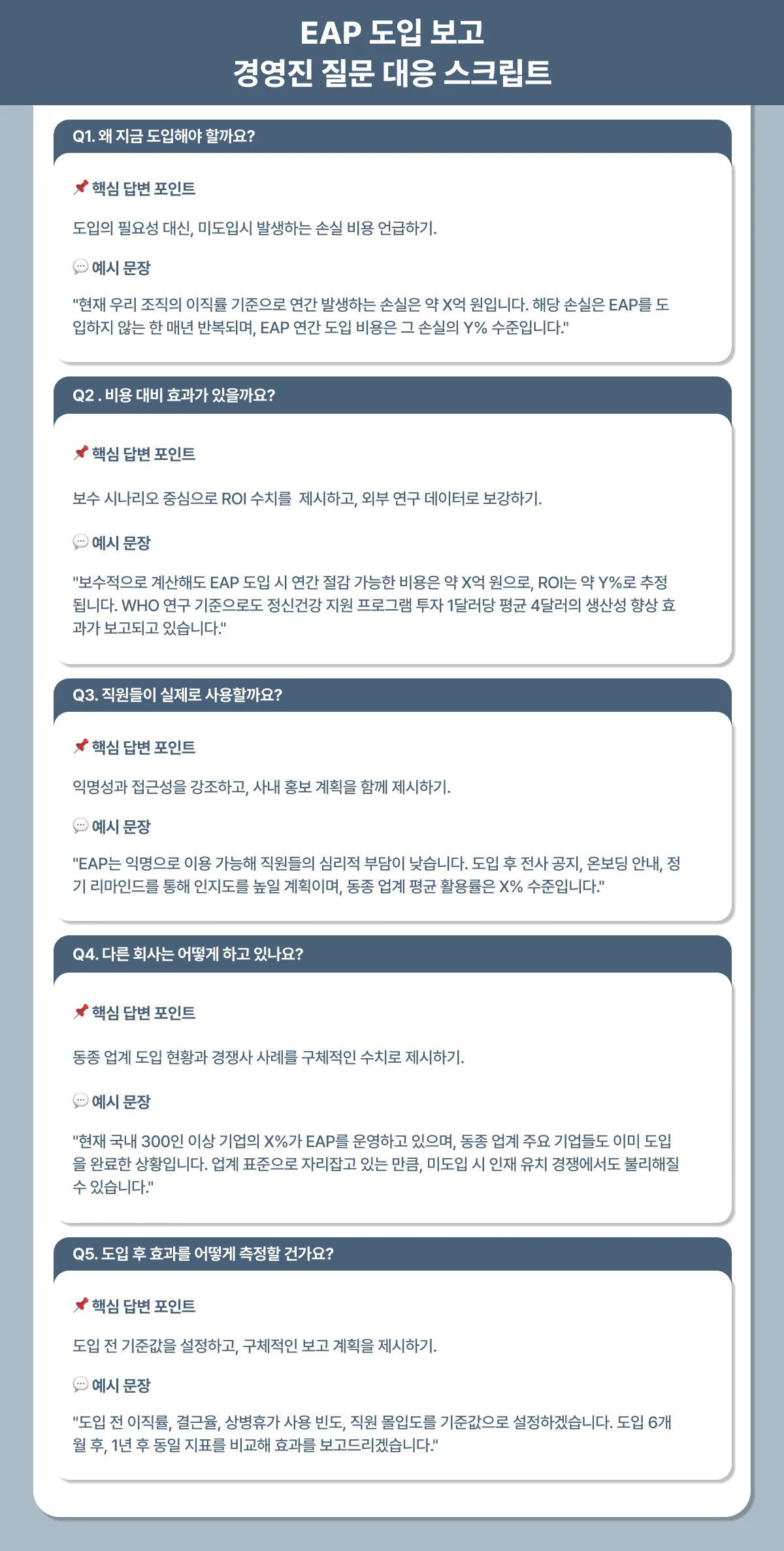 경영진의 질문에 단순히 EAP의 기능을 설명하는 것이 아니라, 이들이 매일 다루는 비용·리스크·성과의 언어로 번역해서 답해야 하는 것입니다. 같은 내용도 경영진의 언어로 답하면, 대화의 흐름이 확연하게 달라질 수 있죠.